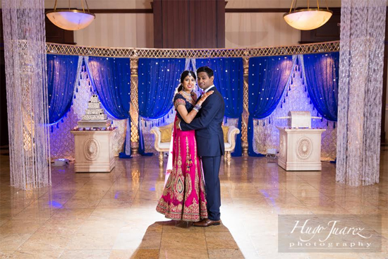 DJ, MC, Dhol player, lighting tech., one assistant, premium sound system, sound system for cocktail hour, 36 color kinetics LEDs for up lighting, laser light show, 30 pin spots for centerpieces, 2 Martin 250 Entour moving heads on vertical trusses providing different lighting effects through out the evening, and custom monogram.